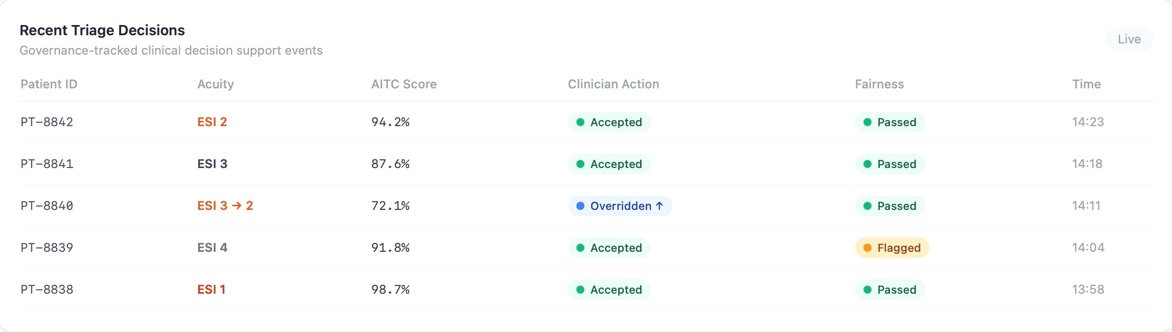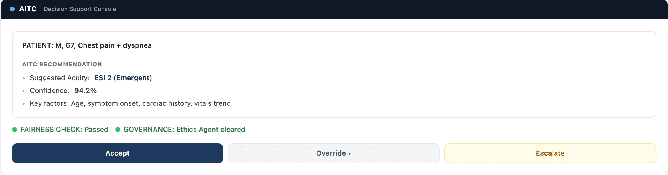 AITC is the first clinical product built on ATL. It gives emergency departments real-time, fairness-aware, explainable triage support — embedded in existing clinical workflows.